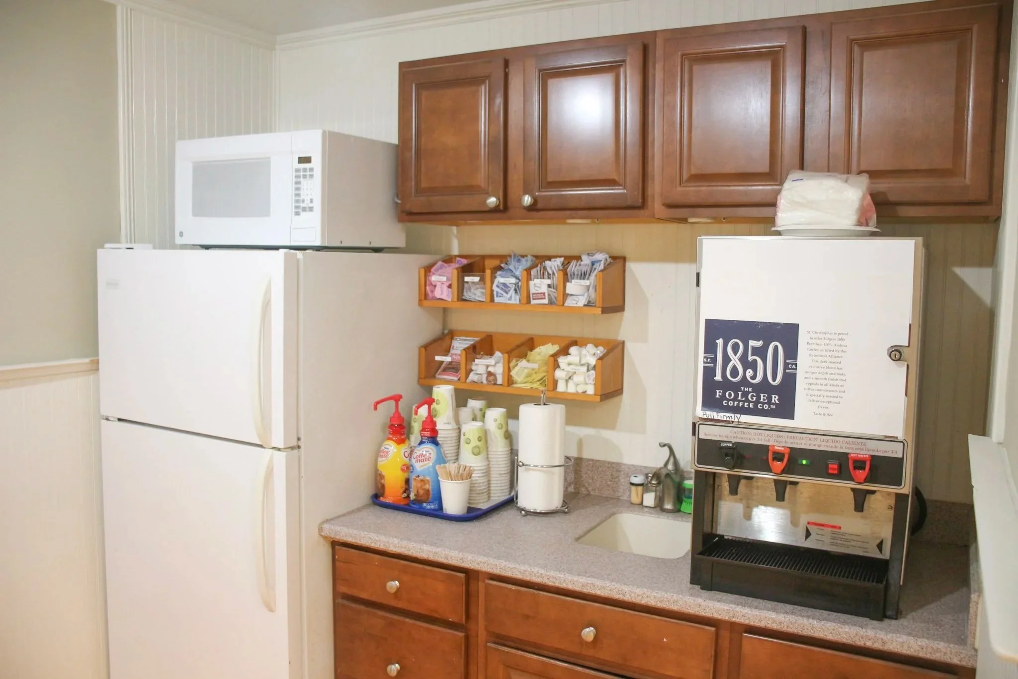 The conference center consists of two meeting rooms (Temple Large and Temple Small), each with a kitchenette and coffee area, ceiling-mounted video projectors, whiteboards, and sound system.
